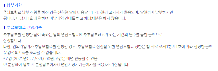 2021년부터 국민연금 추납 납입금액은 최대 120개월로 제한이 되었습니다.